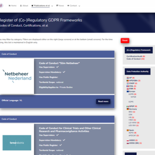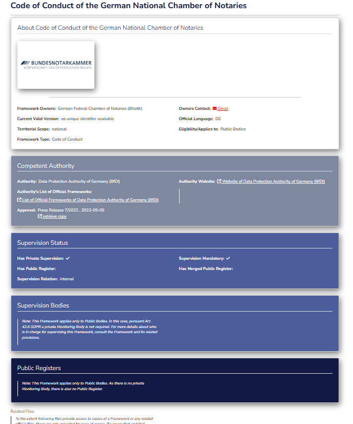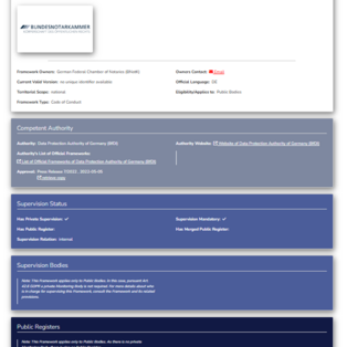 - a GDPR Codes of Conduct and Certifications Detail-Views for each item, e.g., the Detail-View of Code of Conduct of the German National Chamber of Notaries.